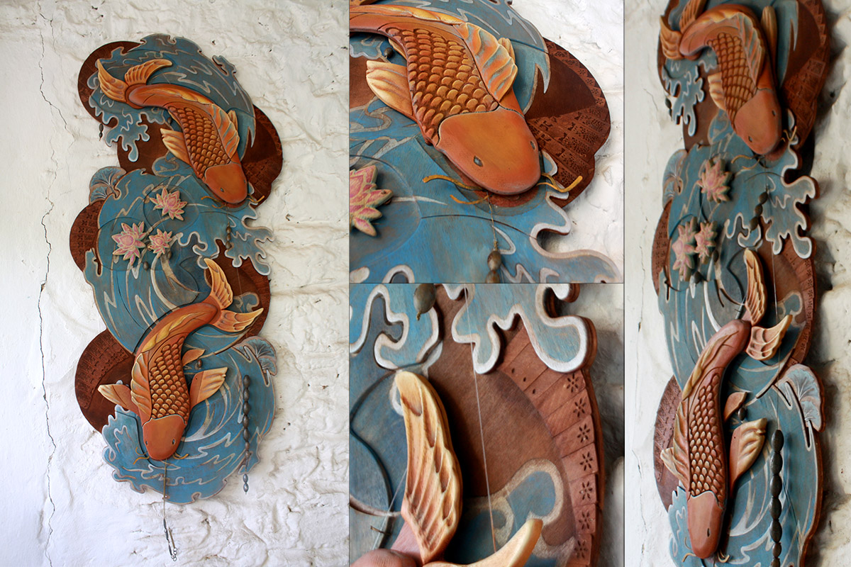Koi fish have a very long history in Chinese and Japanese culture. When I designed the piece I knew that they had a special meaning associated with them but I did not know that both their swimming direction and the colors were important. Last week, while I was searching on the net, I run into this nice post about Koi tatoos. “Koi Fish Tattoo Meaning—Color, Direction, and More” So, according to this post here is the legend: